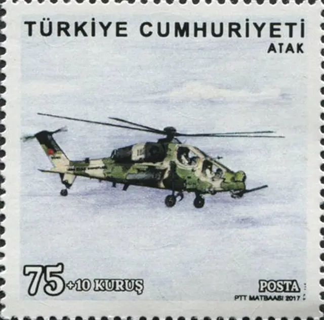 土耳其在2017年发行过一套军事题材的邮票,上图就是其中一张,票面上印着的是土耳其T-129武装直升机,这种直升机被认为是土耳其航空航天的代表作之一,也是目前世界上少数专业武装直升机之一。