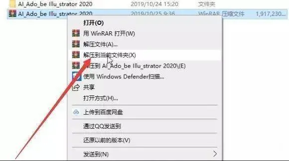 1、解压缩下载的Adobe Illustrator cc2020安装包,建议选择右键,解压到当前文件夹;