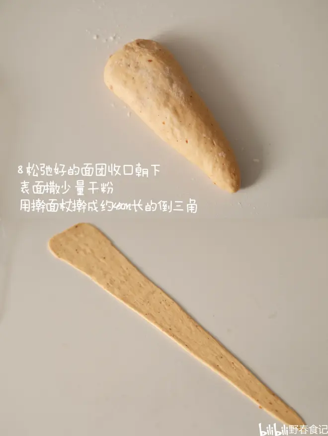 8. 整形:手法见图片;卷起前可刷少量食用油使其花纹裂开均匀(烤箱带蒸汽功能的可以喷蒸汽);底部可粘少量芝麻增加香气