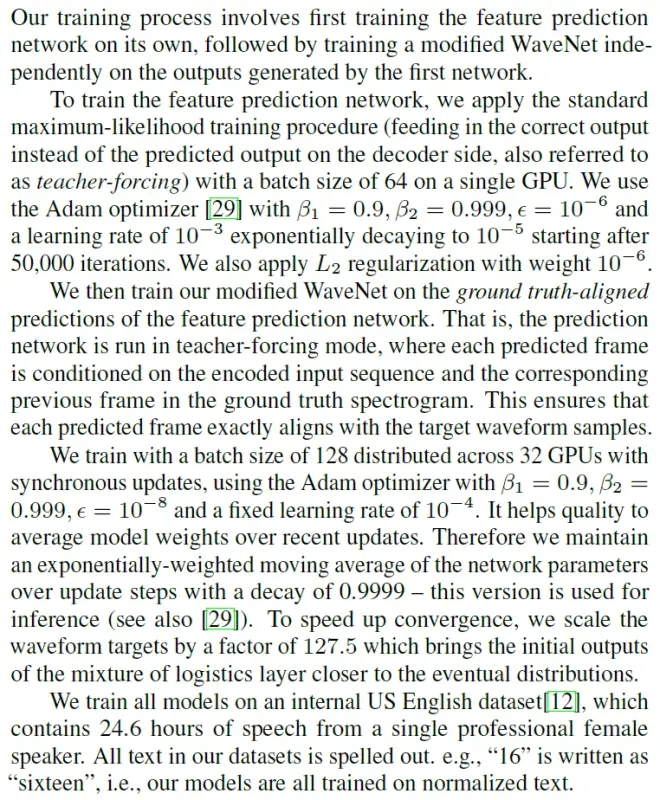 我们的训练过程包括,首先单独训练特征预测网络,然后基于特征预测网络的输出,来训练修改版的 WaveNet我们在单个 GPU 上,使用最大似然训练规程来训练特征预测网络(在解码器端不是传入预测结果而是传入正确的结果,这种方法也被称为 teacher-forcing),指定 batch size 为 64。使用 Adam 优化器并设定参数 β1=0.9,β2=0.999,ϵ=10−8,学习率初始值为 10−3 并在 50000 次迭代后下降到 10−5,使用权重为 10−6 的 L2 正则化。然后我们把特征预测网络输出的预测结果与标定数据对齐,我们使用对齐处理后的预测结果,来训练修改过的 WaveNet,也就是说这些预测数据是在 teacher-forcing 模式下产生的,所以每一个频谱帧数据恰好与一个波形样本对齐。训练过程中,使用 Adam 优化器并指定参数β1=0.9,β2=0.999,ϵ=10−8,学习率固定为 10−4,把 batch size 为 128 的批训练分布在 32 颗 GPU 上执行并同步更新,这有助于使用最近的更新来平衡整个模型的权重。所以我们在更新网络参数时采用衰减率为 0.9999 的指数加权平均 – 这个处理用在推断中。为了加速收敛,我们用 127.5 的缩放因子来放大目标波形,这使得混合逻辑层的初始输出更接近最终分布我们在内部美式英语数据集上训练所有的模型,这个数据集包含 24.6 小时的一位专业女性播音员的语音数据。数据集中的所有文本都被拼写出来了,比如”16” 被写成”sixteen”,即所有的模型都是在预处理过的数据上训练的。
