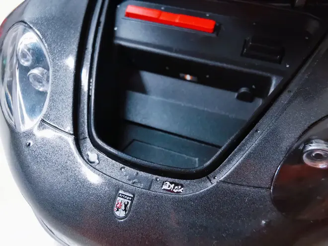 全车铆钉涂制还原、增加门及门框纵面贴纸及锁扣细节、尾盖负面增加贴纸及电线细节、内饰精细分色细涂、补充机油尺、车门饰板部分铬化+网兜分色、车轮铬化、方向盘手刹档把增强细节、前行李舱内部及周边增加灯及贴纸+锁扣细节、增加后牌灯、增加油壶电线。