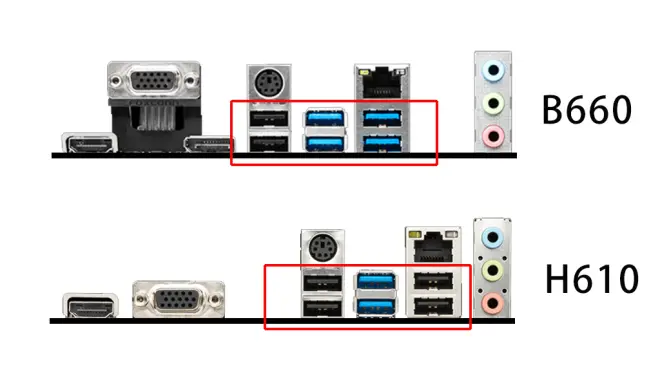 第3个是USB接口的区别,对于H610芯片组来说,一般都是后置USB3.0*2,前置USB3.0*2.对于丐版的B660来说,一般是前置USB3.0*2,后置USB3.0*4.