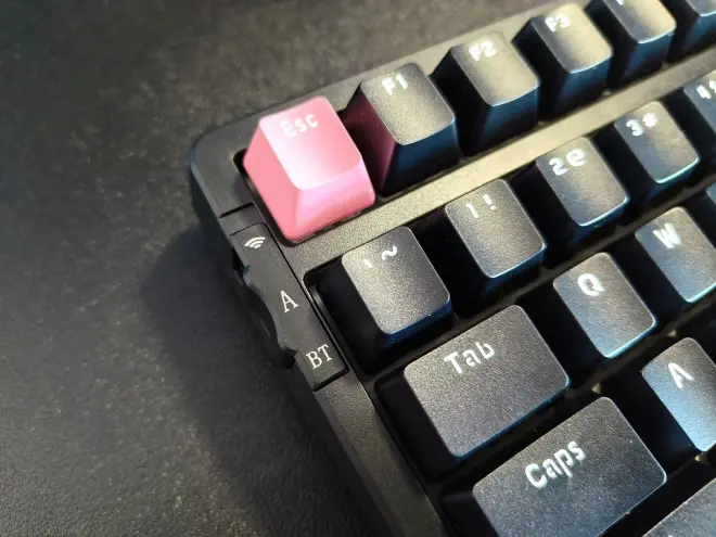 通过键盘左上角的滑动键可通过滑动操作来进行在蓝牙、无线2.4G及有线模式的一键切换,配合Fn+键在多台设备间进行切换使用,工作状态灯被设计在了小键盘区域,一目了然的情况下又不会影响到在打字等日常操作,有线/无线的使用方式,让桌面的摆放也更加灵活。