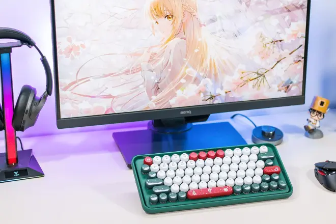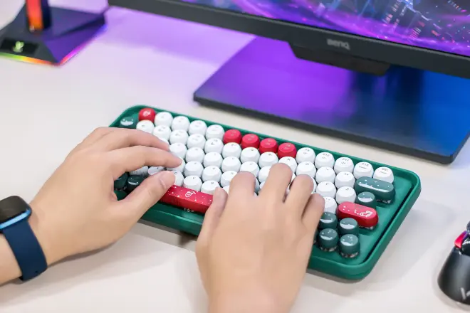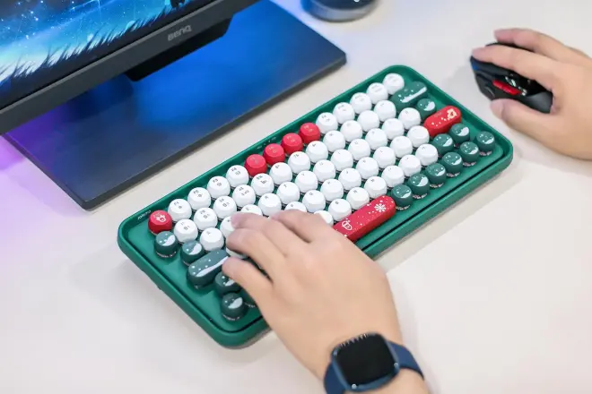 雷柏ralemo Pre 5多模无线机械键盘圣诞定制版外观设计相当精致清新,整体以墨绿色为主色调,并搭配红色与白色的键帽相互补充相互调和,细节方面也充满雪地雪花与圣诞的元素,柔和的白色光效简洁典雅,符合白色圣诞的氛围。79键位配列紧凑布局结构,既节省桌面空间也可轻易携带外出使用。机械键盘支持有线、蓝牙无线与2.4GHz无线三种连接模式,同时兼容Windows与Mac系统的设备,轻易解决在不同设备快速切换这个问题,在设备兼容性上的表现都很不错,可兼容手机平板与笔记本电脑等设备,无线连接稳定响应迅速。