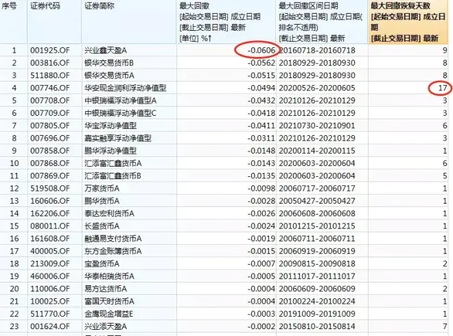 但这种零星小亏,并不影响以月和以年为单位计算收益是赚钱的。网上有位叫“懒猫的丰收日”的博主做过很全面的统计:中国700多只货币基金中,只有23只在历史上出现过短暂亏损,亏损基金数量占比只有3%。而且亏损幅度最大只有0.06%,也就是一万块钱最大亏6快钱。亏损后绝大部分能在1-2天内就赚回来,有一个特殊案例最长是17天也赚回来了。