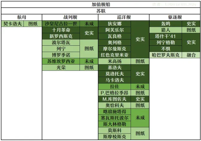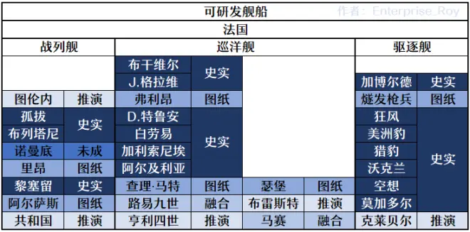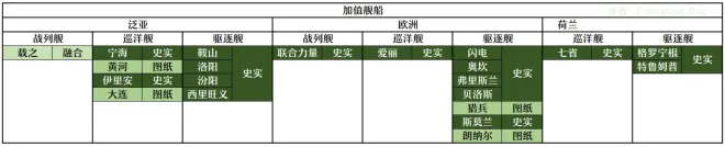 图纸:该舰船的原型为一份或多份历史图纸。如果舰船的原型史实存在,但国籍发生了非史实的变动,则额外标注一个星号。
