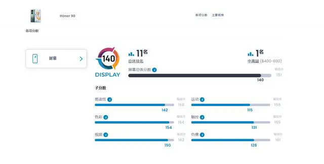 除了屏幕获得的140分总分之外,具体来看,DxOMark荣耀90的屏幕进行了包括可读性、色彩、视频、动态、触控和伪影等六个方面的测试和评价。该机在可读性方面得到了142分,在色彩方面得到了154分,在视频方面得到了150分,在动态方面得到了115分,在触控方面得到了131分,在伪影方面得到了128分。这些成绩都非常出色,显示了荣耀90在各个方面都有着平衡和优秀的表现。