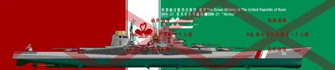 本舰很明显会是这部小说的主角,关于科恩海洋联邦共和国的内容接下来的专栏会写。 进入21世纪后,科恩海军现有的大型水面舰艇很明显已经不足以支撑起日益激化的海上冲突。出于国防战略需求,科恩海军同时启动了新一代大型核动力航空母舰和战列舰的研制工作,并开始向国内三大设计局招标。 2007年,科恩海军宣布将采纳雷尔瓦多海洋集团设计的BBNX—01型方案作为新一代战列舰的研制方向,并正式开工。 2012年,BBNX—01首舰下水,在经过长达一年多的海试与舾装工作后,BBNX—01更名为BBN“爱尔尼亚”级,首舰BBN—21“爱尔尼亚”于2014年初加入现役。二号舰BBN—22“莱辛巴赫”于2016年入役。
