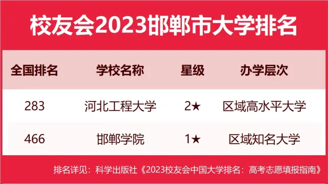 为了给2023年全国高考考生和家长选择填报邯郸市高校提供报考指南,全国第三方大学评价机构艾瑞深校友会网撰写完成、科学出版社出版发行的《2023校友会中国大学排名:高考志愿填报指南》最新发布校友会2023邯郸市大学排名。