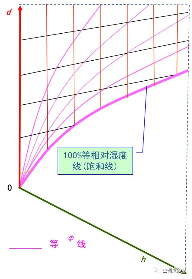 等含湿量线就是等露点温度线。因为露点温度的定义已说明含湿量相同的状态点,露点温度均相同。