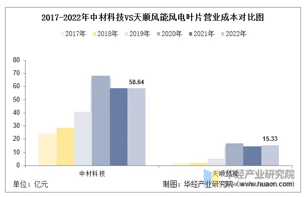 2022年,中材科技的风电叶片营业成本为58.64亿元,同比下降0.22%。天顺风能的风电叶片营业成本(15.33亿元)较上年增长3.68%。