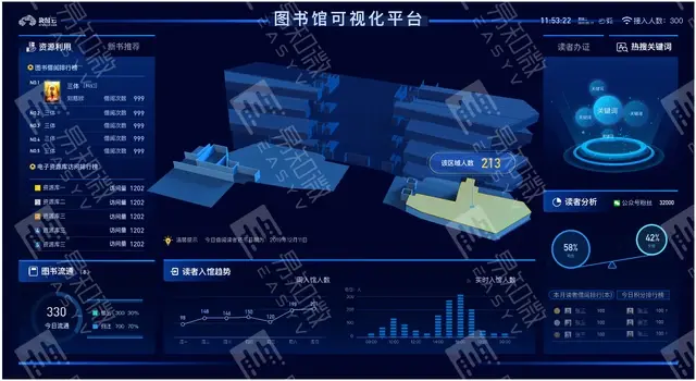 为了更好地响应国家政策的号召,2018年易知微为某市图书馆定制可视化综合大屏,打造包括馆内人流分析监测、读者画像分析、借阅行为洞察等数据分析的可视化大屏系统,为其提供馆内建设与活动运营的监控分析服务。从多角度全面地帮助用户及时把握场馆运营效果,多维度多组合地帮助用户对比活动运营与书籍借阅跟踪,实现运营建设的效果最优化、效益最大化。