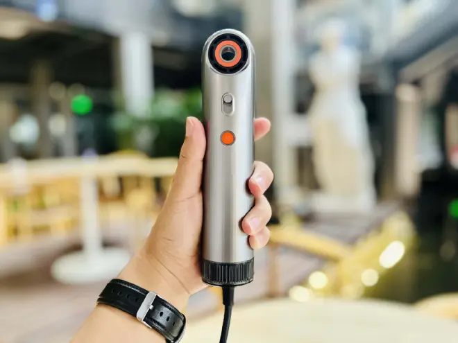 不啰嗦,咱们直接来看外观。电吹风整体设计极其简洁,一改传统电吹风的样式,看起来一点都不像电吹风。正面只有一个按钮,短按切换吹风模式,长按是关机。开关键的上面有一个可以无极滑动的调节杆,可以快速调节风速,顶部橙色的小圈就是出风口,采用磁吸动能环,风口很小,但是风很大。