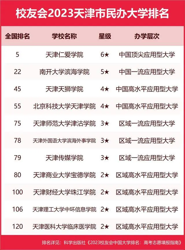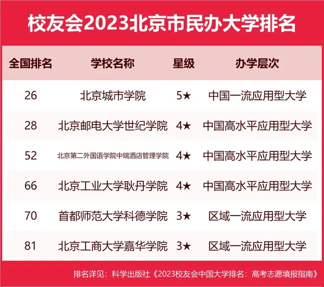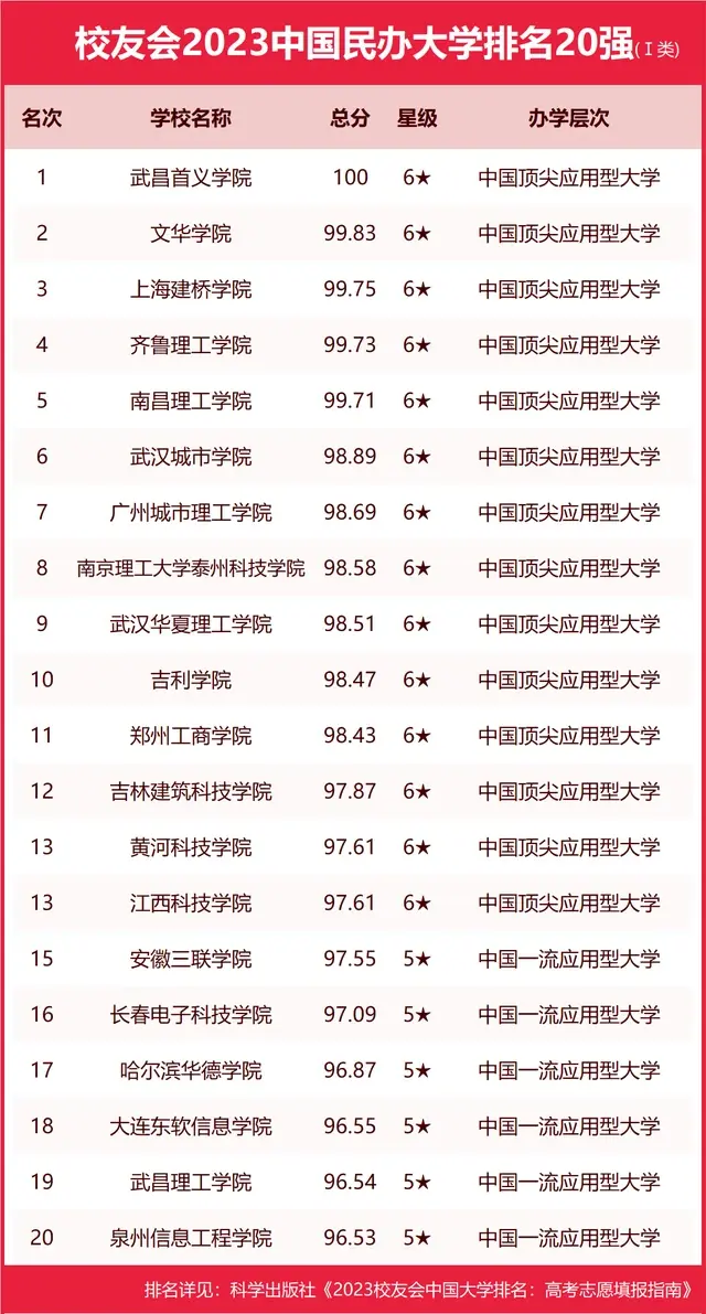 最新校友会2023中国民办大学排名显示,武昌首义学院、文华学院、上海建桥学院、齐鲁理工学院、南昌理工学院雄居2023中国民办大学排名I类前5强。三亚学院、广州南方学院、四川大学锦江学院、西安培华学院、天津仁爱学院位列2023中国民办大学排名Ⅱ类前5强。西安欧亚学院、昆明城市学院、武汉学院、福州外语外贸学院、山东协和学院位列2023中国民办大学排名Ⅲ类前5名。