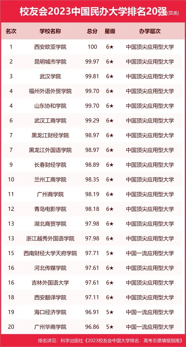 武昌首义学院、三亚学院、西安欧亚学院、山东协和学院、黑龙江外国语学院、青岛电影学院、华南农业大学珠江学院、南京师范大学泰州学院、武汉体育学院体育科技学院分列校友会2023中国理工类、综合类、财经类、医药类、语言类、艺术类、农林类、师范类和体育类民办大学排名第一。