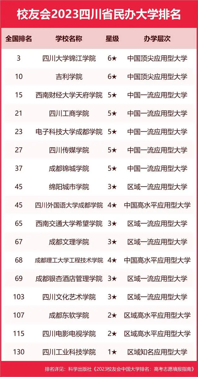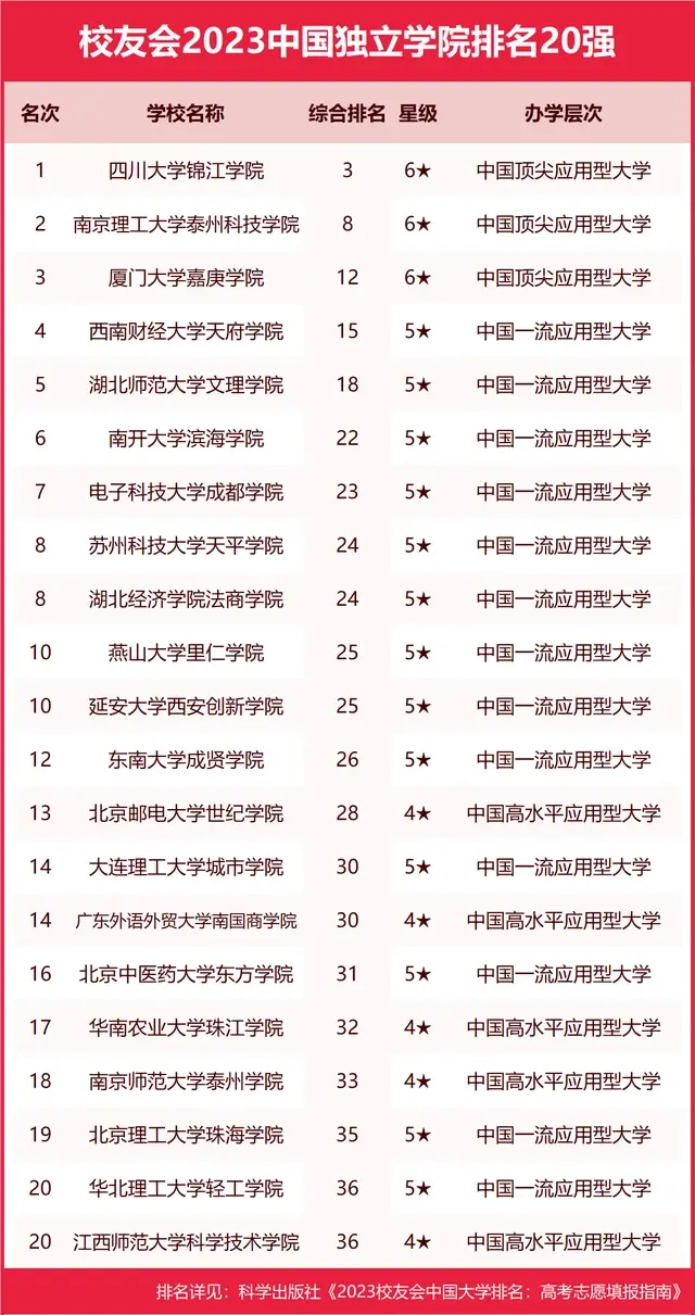 其中,四川大学锦江学院、南京理工大学泰州科技学院、厦门大学嘉庚学院、西南财经大学天府学院、湖北师范大学文理学院名列校友会2023中国独立学院排名前5强。