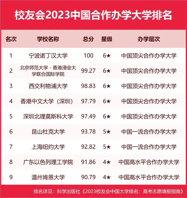 榜单显示,宁波诺丁汉大学、北京师范大学-香港浸会大学联合国际学院、西交利物浦大学、香港中文大学(深圳)、深圳北理莫斯科大学雄居校友会2023中国合作办学大学排名前5强。