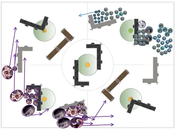 最上方的尖啸杀手向第二方向前进,让炼狱盟主暴露在自己的视野中,第二头尖啸杀手紧随其后,随时准备二次冲击,武士虫和死亡跳跃者则加速移动(加速骰为1,2),控制住任务点。