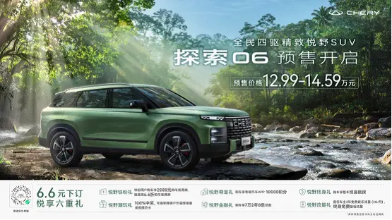 一起悦野,一起探索。8月10日,奇瑞汽车旗下全民四驱精致悦野SUV探索06正式开启全球预售。新车推出一款两驱版型和两款四驱版型,预售价格12.99万元——14.59万元。此外,探索06同步开启预售多重福利,消费者可以通过官方商城、天猫、京东、抖音、快手、奇瑞汽车app等平台下订,仅需6.6元即可悦享六重礼: