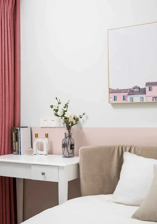 主卧采用与客餐厅相同的方式打造背景墙,柔和的樱花粉可爱精致,与干净的白色搭配温柔又美好。