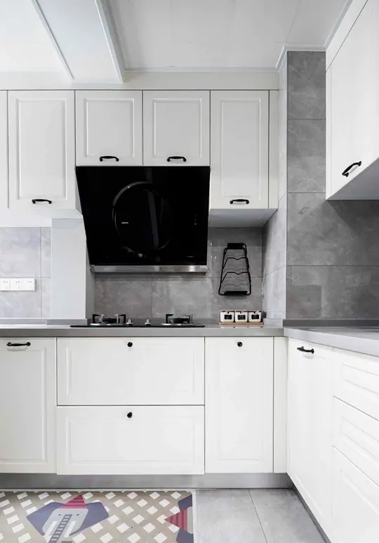 白色橱柜格外澄净,灰色增加空间层次感,让小空间的厨房拥有高级的视觉体验。