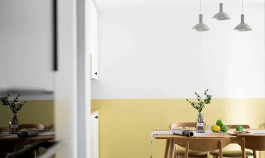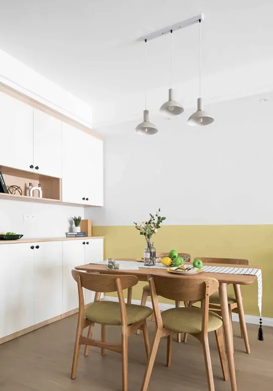 春意盎然的暖黄色,一改传统北欧的质朴,俏皮中带着文艺清新,与原木桌椅相得益彰。