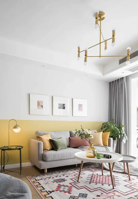 沙发背景墙采用暖黄与浅灰拼色,为空间整体增添温暖的感觉。搭配简约的灰调、少许的粉色与柠檬黄,层次感立显,让空间氛围更为灵动。