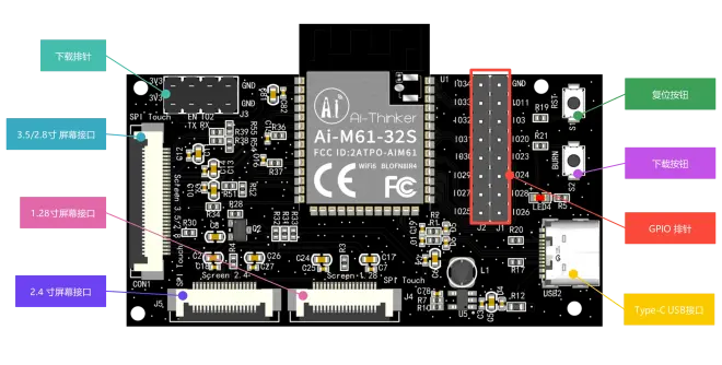 所搭载的Ai-M61-32S 模组具有丰富的外设接口,具体包括 DVP、MJPEG、Dispaly、AudioCodec、USB2.0、SDU、以太网 (EMAC)、SD/MMC(SDH)、SPI、UART、I2C、I2S、PWM、GPDAC、GPADC、ACOMP 和 GPIO 等。