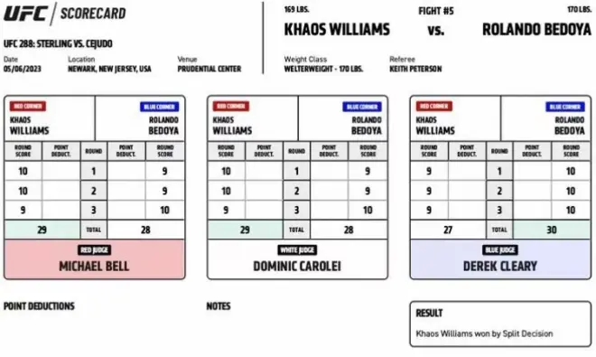 通过赛后技术统计和官方打分卡可以看出,本场前两回合,裁判存在分歧争议。从打击数据层面看,两人几乎不分伯仲,贝多亚的头部打击数和整体命中率更高。不过从视角效果看,威廉斯的重击更加凶猛。如果我是打分员,可能会把前两回分别合各判给一方,使贝多亚以29比28获胜。总之此战确实公说公有理、婆说婆有理,很难界定。