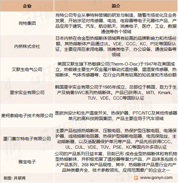 热熔断体主要竞争企业