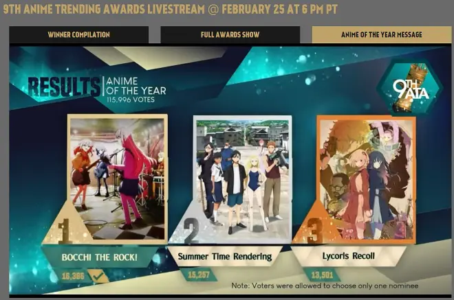 年度动画奖项其实竞争相当激烈,同时入围的还有《莉可丽丝》和《夏日重现》这两部优秀作品。《莉可丽丝》整体得票略低于其他两部排在第3,而《夏日重现》则是以1129票的微弱劣势惜败《孤独摇滚》排行第2位。