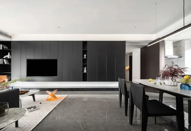 简约风装修案例,客厅电视背景墙做储物柜设计,把电视嵌入进墙体里,达到功能的实用性与装饰性。