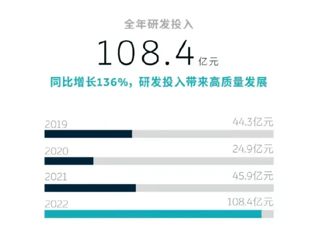 蔚来2022年在研发这块投入了高达108.4亿元,要知道理想去年也才投了67.8亿元,蔚来的研发投入快接近理想的两倍了。这么高的研发投入,交付量却还是不尽人意。