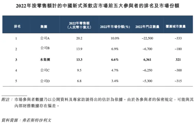 招股书中引用了弗若斯特沙利文的报告,数据显示,茶百道是中国前十大新式茶饮企业中增长最快的一家,2020年—2022年零售销售额年复合增长率最高。按2022年零售额计,茶百道在中国新式茶饮店市场中排名第三,市场份额达到6.6%。