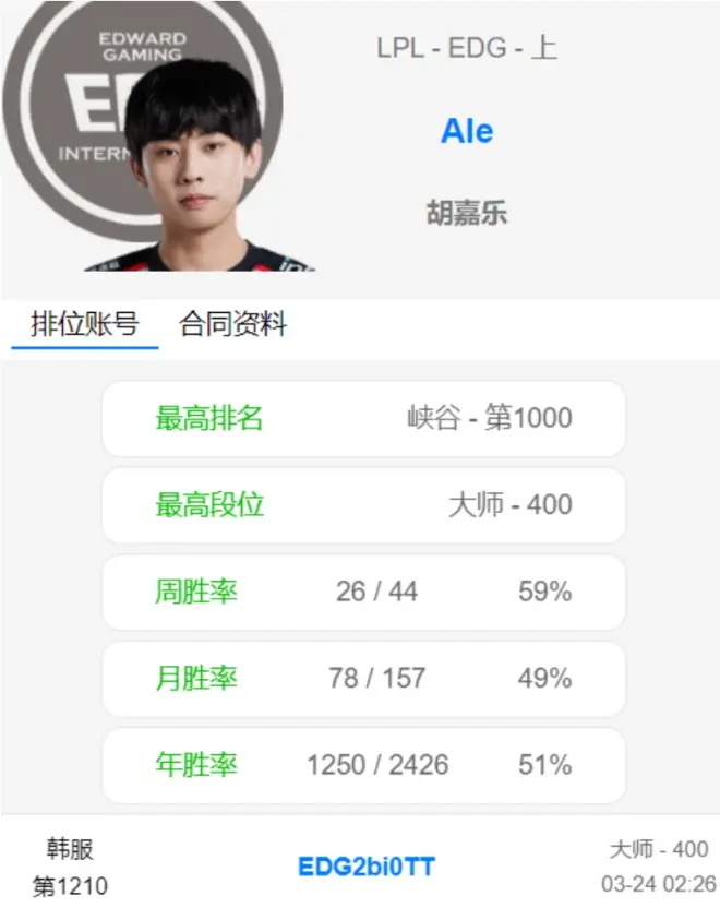 翻看EDG在LOL韩服的Rank主页,队长兼主力辅助Meiko、野王Jiejie、中单FOFO、下路Leave全部身处最强王者段位,其中FOFO顺利晋升千分王者,而身处大师段位低的阿乐改名“EDG二比零TT”,短短几个字,足以说明阿乐的决心。