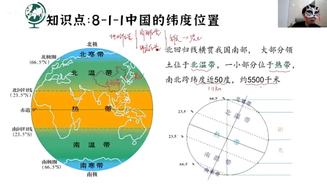 纬度位置:大部分位于北温带,少部地区位于热带; 中国大多数地区可以种植温带作物,少部分地区可以种植热带作物;我国最北端是漠河(黑龙江省),最南端是曾母暗沙。(建议“四至点”背下来)06:04