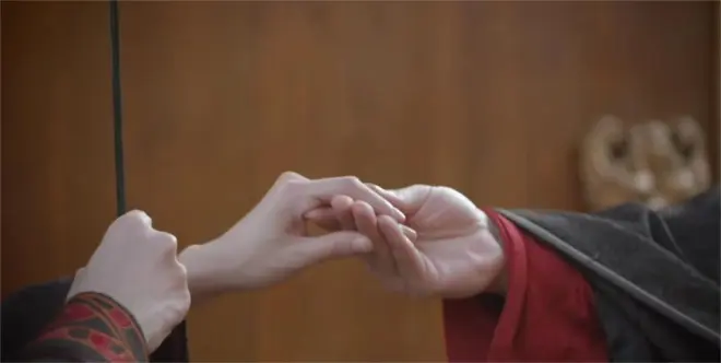 突然一只有力的大手伸了过来,一双温柔的眼隔着团扇望着她,虽然她有些羞怯,但是没有犹豫地把自己手也伸了过去,这一个时刻便是最动人的“执子之手,与之偕老。”