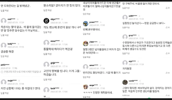 韩网友们纷纷留言“实验精神诚可贵,可能真的很好奇”、“对不起,最近真的很累让我笑了”、“原来不救啊,下雨天不救,狗就是狗”、“伴侣犬多荒唐,为啥进那里,狗哪有劲儿”、“世界太疯狂了,进去多深会被卷走”、“死者无言,生者三人对口供完全犯罪了”、“想虐待动物逆袭,40多岁白活了”、“世界太险恶需要验证,以为是海外新闻”、“真的是浪费公共资源,合理怀疑同行人”、“是不是真的?正常人谁会进去?找个游泳池啊!真的好荒唐”、“受过训练的狗才施救,再说这几天下大雨谁也救不了”等表示无语。