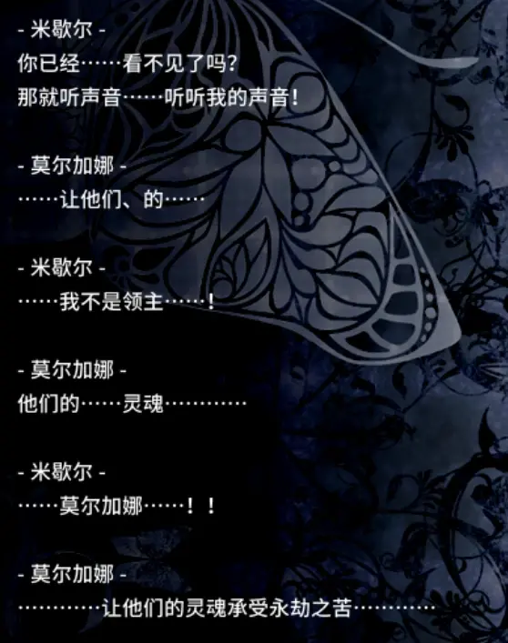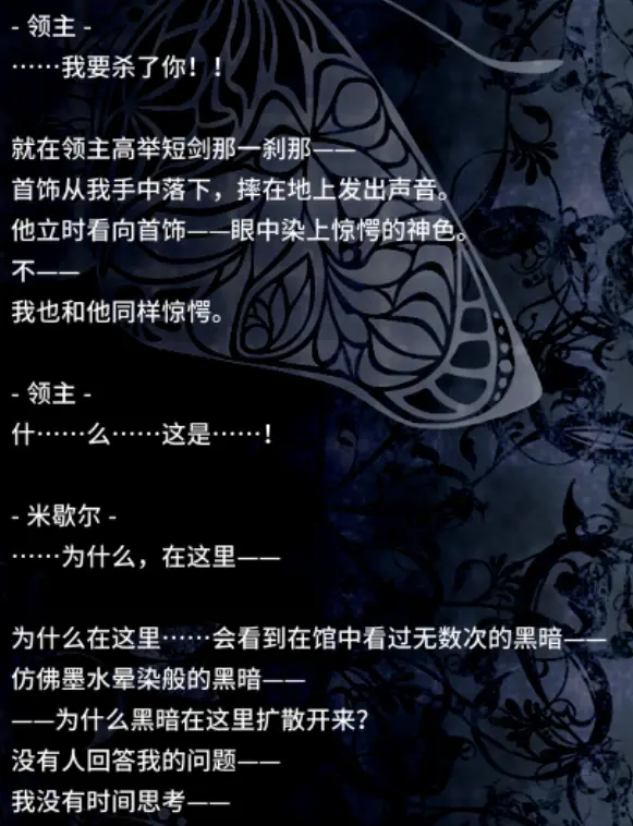就像……莫尔加娜对我做的那样…是我……害他变成这样的吗?是我……唤出了馆中的黑暗吗?所以才揭示了他的过去吗……不想看的光景展现在眼前……回到那时的感情,那时的想法。我让他又一次体会了绝望吗。