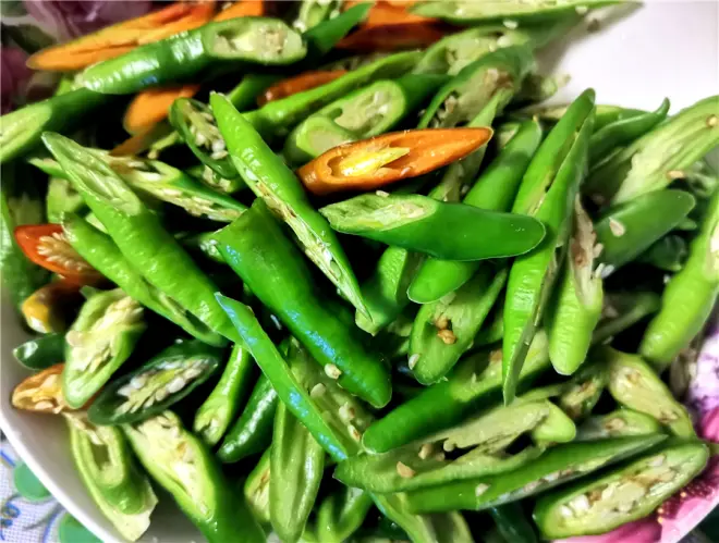 以前,泸州人做这道菜的时候,用得比较多的是朝天椒;现在,不喜欢太辣的朋友,多数改成用二荆条(市场上有一种二荆条,看上去吓人,但一点都不辣);但也有些喜欢辣的朋友,还会额外加入小米辣。