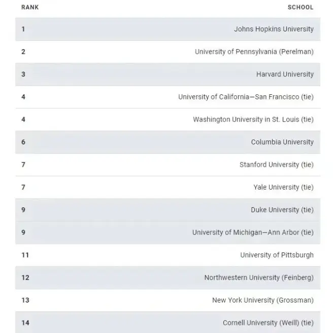 今年的新医学院排名,哈佛大学的榜首之位,被去年排名第三的约翰霍普金斯大学取代,据数据指出,约翰霍普金斯大学在研究方面排名第一;