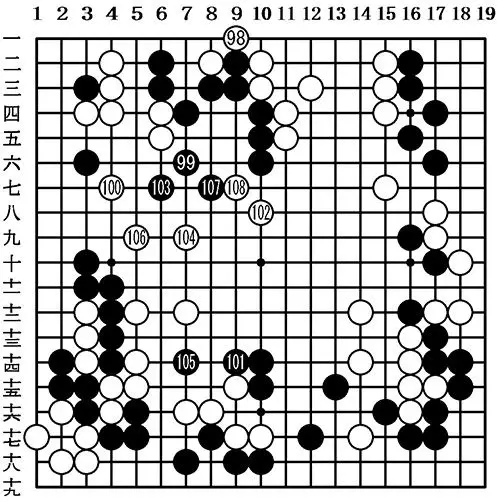 井山裕太说这里单纯就是运气好,不过村川大介表示:“这也是实力的体现”。所以说白98这手棋是这盘棋最后的机会。