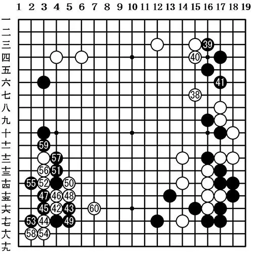面对左下角黑棋的拆二,白42的碰是局部的常用手段。村川大介说:“这里有很多变化,根据周围的配置会有不一样的下法”。井山裕太为了和右下角的黑棋形成关联,选择了黑43的上扳,白44的时候看到黑45之后征子依然是白棋有利,但是黑59的时候吃掉白棋3子收获依旧巨大。井山裕太表示:“如果下方没有被进攻的很惨,黑棋这里感觉便宜了一些”。
