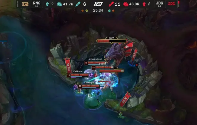 进入LOL召唤师峡谷,JDG与RNG平稳度过对线期,并未爆发过多团战,此后JDG占据野区关键位置视野,通过打团不断扩大优势。