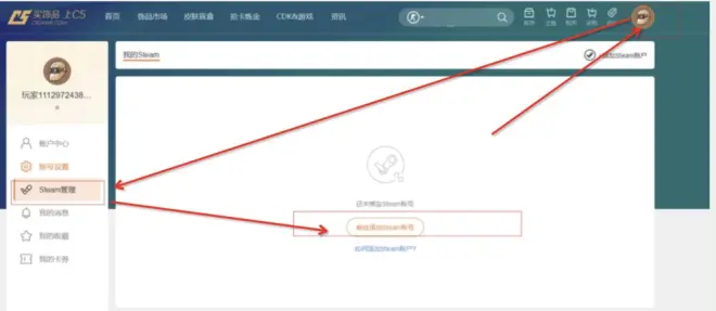 2、在您登陆饰品交易网站后,第一步则是需要绑定您的STEAM账号。