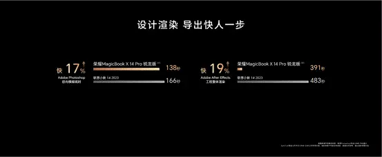 荣耀MagicBook X Pro系列锐龙版是同档位首批搭载最新AMD 锐龙7 7840HS标压处理器的轻薄本,性能表现一骑绝尘。该芯片采用全新4nm制程工艺和Zen4架构,8核16线程,最大加速时钟频率可达5.1GHz,单核性能提升15%;在Photoshop和AE渲染导出大文件场景下,仅需138秒和391秒,渲染导出速度相比竞品最高提升了19%,大大提升用户的工作和学习效率。