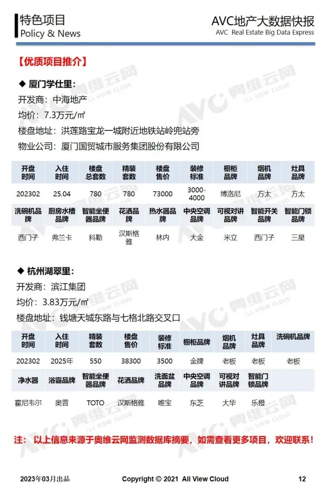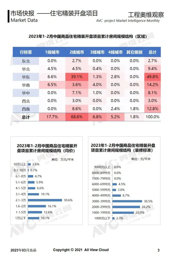 2023年1-2月,商品住宅开盘精装项目从房间套数规模结构分析,主要分布在华东、二线城市,占比49.8%、68.6%。合肥、杭州、上海成为1-2月份全国开盘规模前三甲城市。