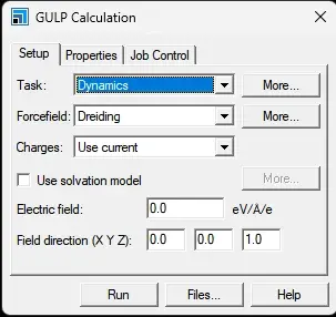 2.从菜单栏中选择Modules | GULP | Calculation(模块|GULP |计算)以显示GULP Calculation对话框。