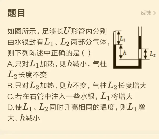 到底哪里有问题?这也是本文民科的一点了,以上这段话并没有什么道理,因为在本文塑造的民科热力学宇宙里,条件的变化即为右侧液柱压强的变化,而B中压强不变,因此右侧液柱会“挤压”B,使B体积减小,再依据pV=CT得到B中压强变大,因此B再往上“挤压”左上方液柱,使h1=h2,不难得出AB选项正确.多么奇妙,向右侧注入水银,液面反而下降了.