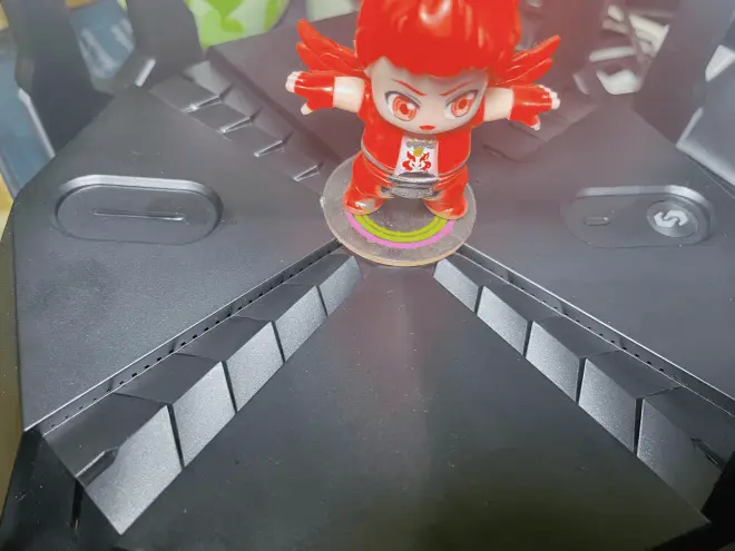 锐捷天蝎电竞路由器外观方面为规则八边形圆盘造型,四向4×4射频架构增益天线设计,正面则是使用了十字鳞片式面板散热孔,整体外观来看确实有点天蝎那个味儿了。正面除了一颗系统指示灯之外还配备了一颗氛围灯,可以通过灯光颜色来判断是否开启游戏加速功能。可以通过实体按键进行一键Mesh组网和游戏加速,可以说十分方便。